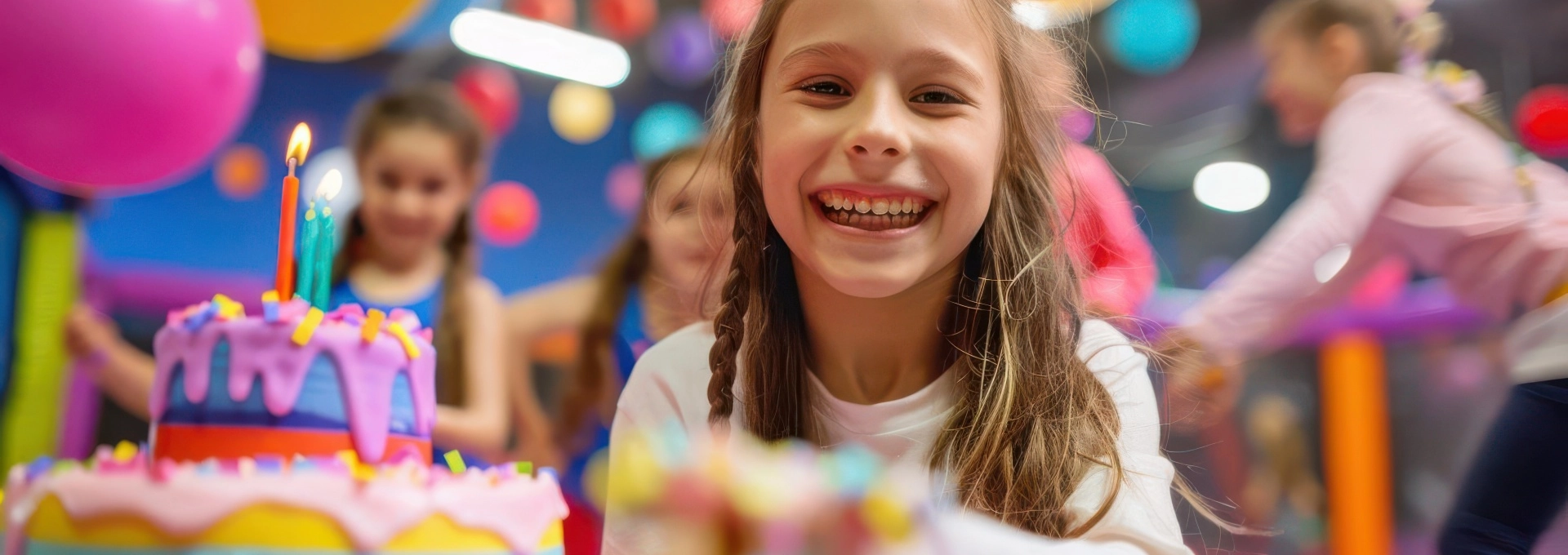 - Décorer l’espace goûter : utilisez des ballons, des banderoles et une nappe aux couleurs vives pour créer une ambiance festive. Vous pouvez même reprendre le code couleur des trampolines du parc pour une cohérence visuelle.